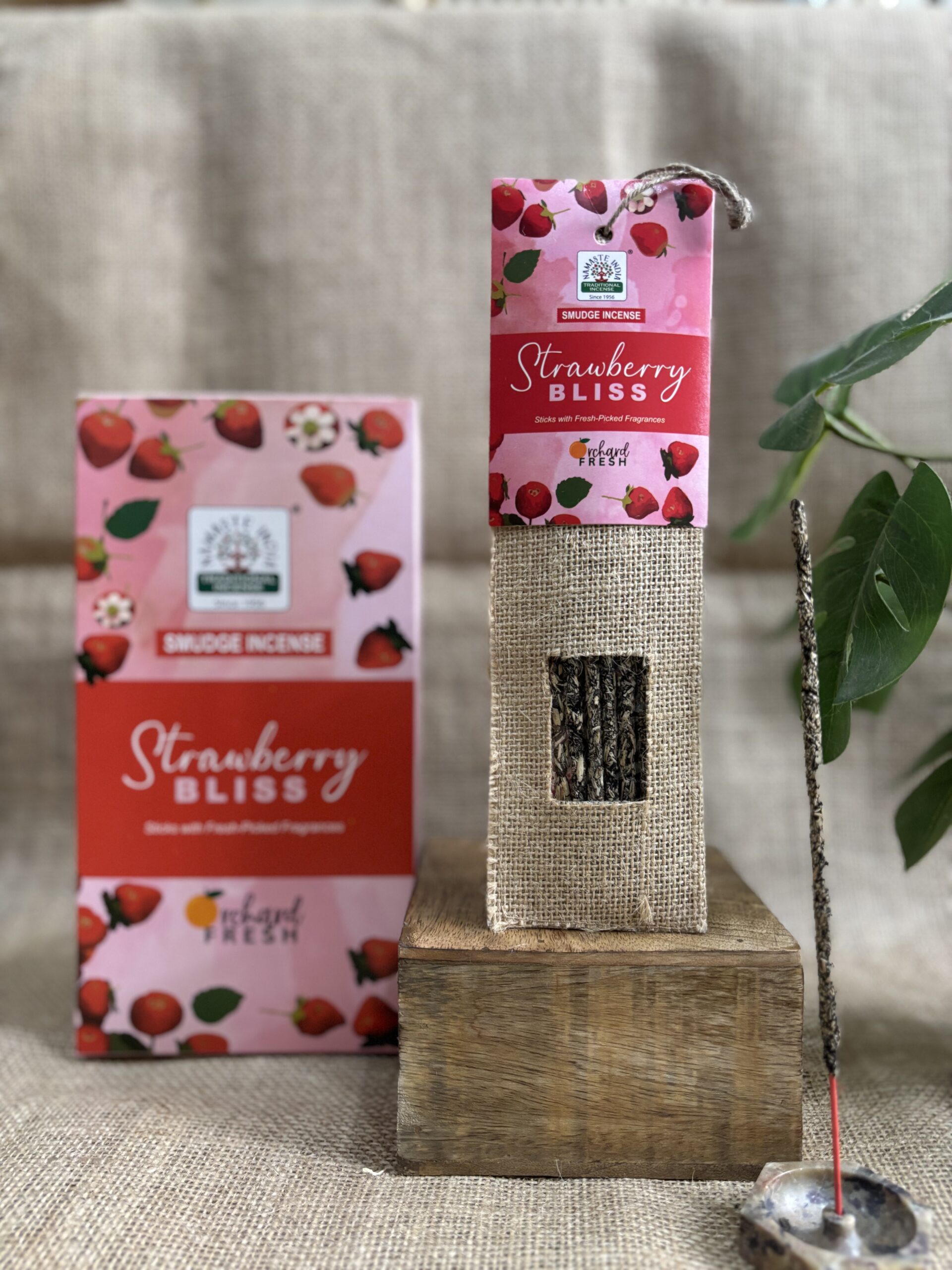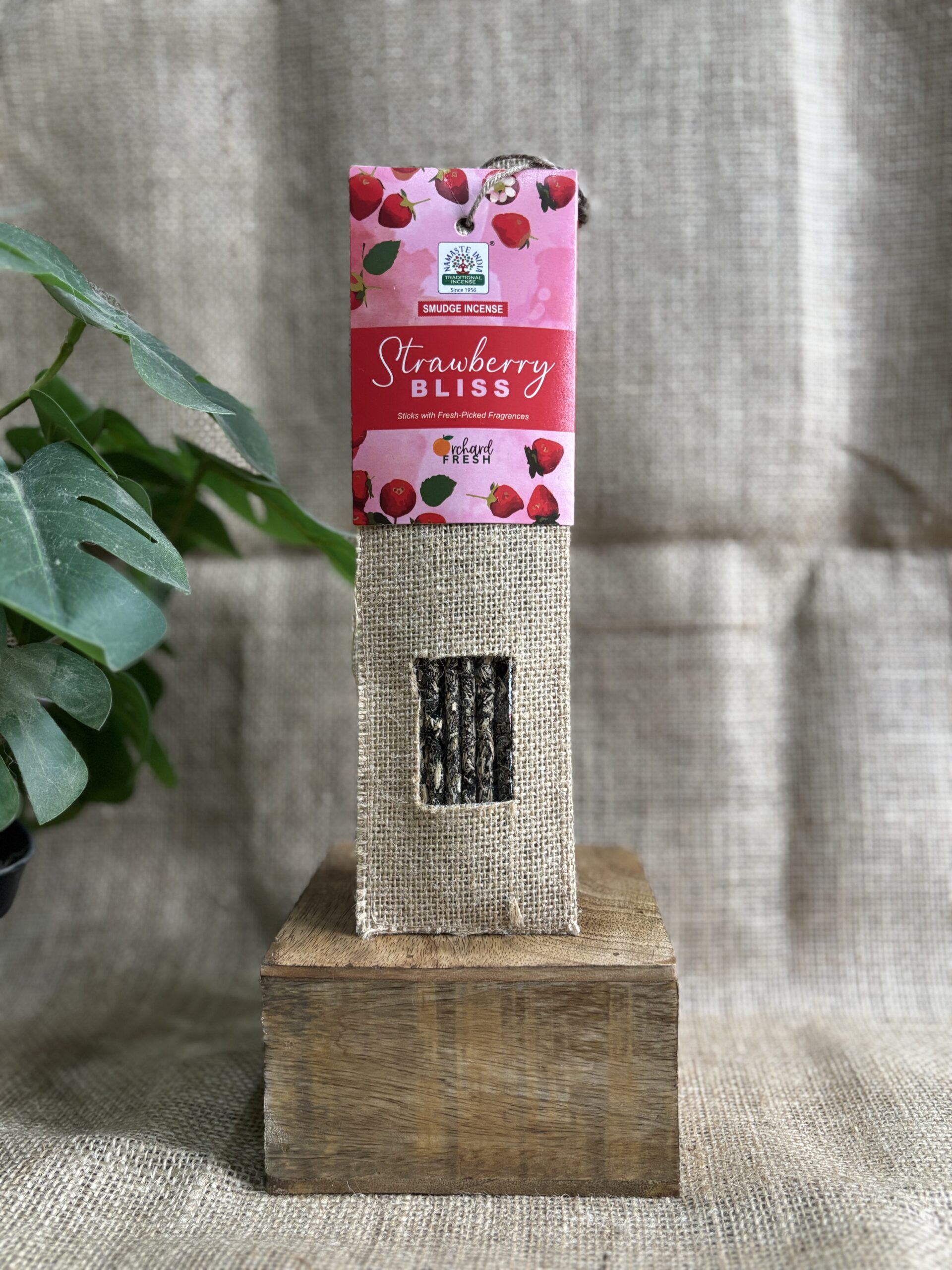 Ręcznie rolowane kadzidełka w naturalnym jutowym woreczku o jasnym, soczystym zapachu świeżych truskawek. Owocowy aromat dodaje energii, odświeża przestrzeń i wprowadza letnią lekkość do codziennych rytuałów.